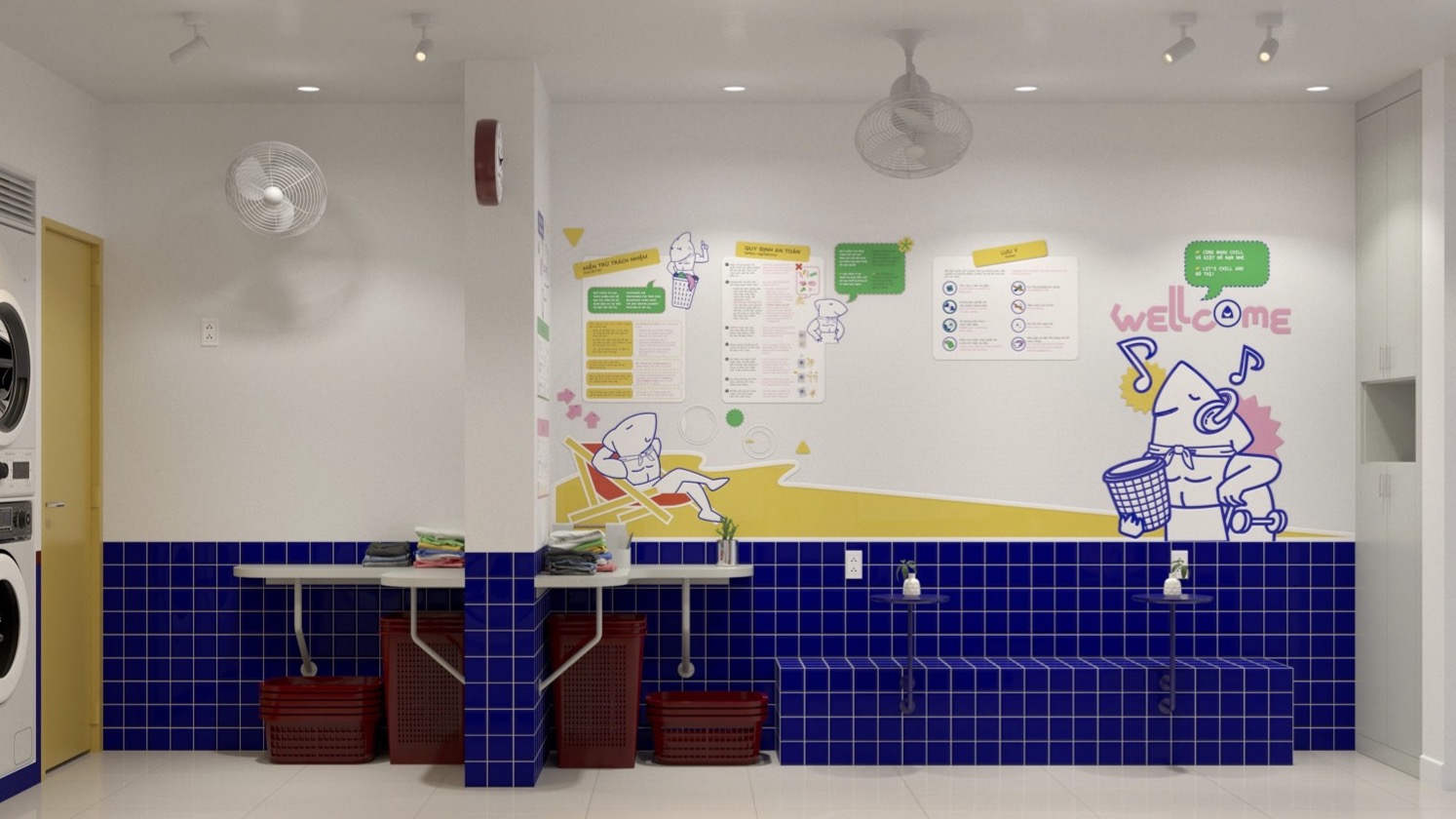 Bố trí mặt bằng khoa học: Phân luồng khách hàng, khu vực máy giặt, máy sấy, khu vực gấp đồ, khu chờ thông minh.